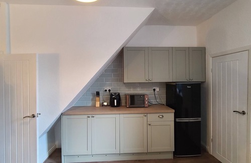 The kitchen has a fridge freezer a hob, an oven, a kettle, air fryer,and a microwave.
