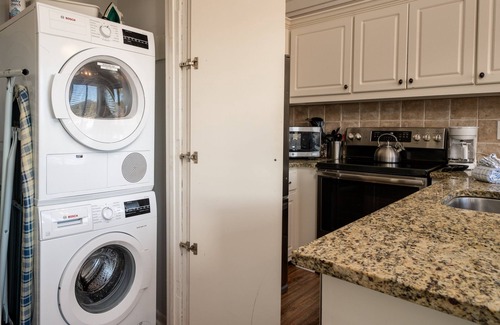The open floor plan is accentuated by vaulted ceilings and wood laminate flooring, creating a bright and airy ambiance throughout the living area. The fully equipped kitchen includes stainless appliances, granite countertops, and a dining area, making it easy to prepare and enjoy meals together.