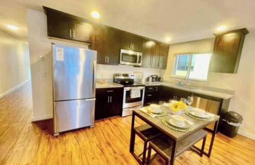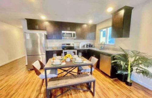 The fully equipped kitchen boasts stainless steel appliances, cookware, and coffee essentials—everything you need to feel at home. Plus, enjoy the convenience of an in-unit washer and dryer.