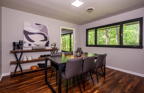 To the left of the kitchen is the dining room and on through is the living room with a wall of windows and a wood burning fireplace. You will also find a smart TV and nice luxurious furniture. There is also an all-season sunroom on this main level for all seasons.
