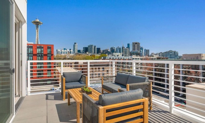 Experience the best of Seattle from our 2BR, 2-bath penthouse apartment boasting panoramic views of the Space Needle, Mt. Rainier, and the Puget Sound. Relax on the massive private balcony or enjoy modern comforts indoors with a fully stocked kitchen, 65` Smart TV, and in-unit washer/dryer. Perfectly situated for exploring Seattle`s main attractions, dining, and entertainment, this upscale retreat offers comfort and convenience for an unforgettable stay. Book now for the ultimate urban escape!