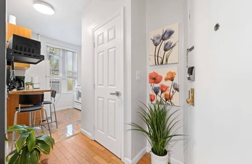 Immerse yourself in the privacy of your own exclusive retreat, complete with a fully furnished bathroom, ample closet space, and a well-equipped kitchen. This exceptional gem nestled in the heart of Manhattan ensures a delightful stay. The studio features a comfortable double bed, a fully stocked bathroom with all the necessary amenities, and a convenient kitchen. Additionally, a table and chair set are provided, serving as a versatile space for dining or as a dedicated work area. We have also created a cozy corner seating arrangement where you can indulge in reading or enjoy the flat-screen TV that comes pre-loaded with popular streaming services like Netflix and HBO. To accommodate your personal belongings, a spacious full-size closet is at your disposal throughout your stay. The bathroom boasts a well-stocked selection of essential toiletries and fresh towels, ensuring your comfort and convenience.