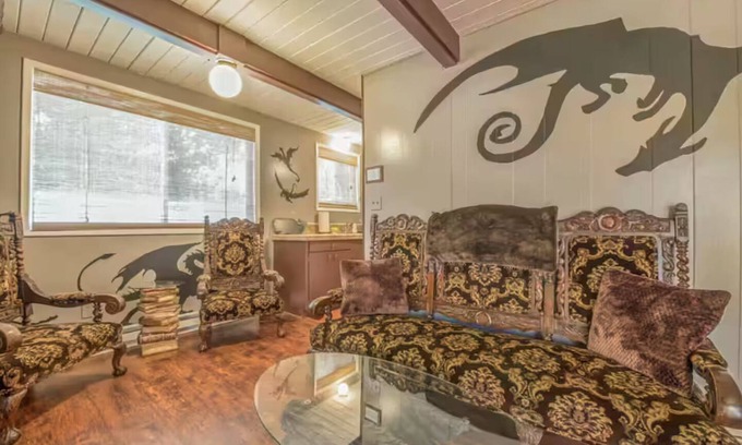 'Tis a two-chambered dwelling with a full kitchen to attend to thy culinary needs. Up to five weary travelers may take refuge within its walls. Fear not, for there is free WiFi and cable to keep thee connected to the world beyond. A wood-burning fireplace dost grace the main hall, though wood shall not be provided. Hardwood floors give the dwelling a warm and rustic feel. Regrettably, pets are not permitted within. Two carriages may be parked in the designated spots, but beware, for the dwelling is two stories high and stairs must be climbed to reach the bedchambers (the privy is located on the ground floor).