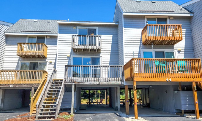 The ocean beach is 0.3 miles down the road from this two-story townhome half a mile from downtown Duck. Not only will you be able to stroll to the sand each morning, but you\'ll also have a neighborhood swimming pool and tennis courts to keep you entertained in the afternoons. This townhouse enjoys a fantastic location in Duck - about half a mile south of downtown, where you\'ll find the Duck Town Park Boardwalk, Duck Donuts, and a number of other restaurants, shops, and conveniences. No matter how you choose to spend your days, you\'ll delight in coming back to a house that has been newly furnished from top to bottom. The living room is full of sunlight, with sliding glass doors that lead outside to a deck. There\'s also a well-appointed kitchen, a dining area for six, and a balcony adjoining the primary bedroom suite - the perfect place for coffee at sunrise. Central AC will keep you cool all summer, and a washer/dryer is on hand for your swimsuits and towels. COMMUNITY AMENITIES