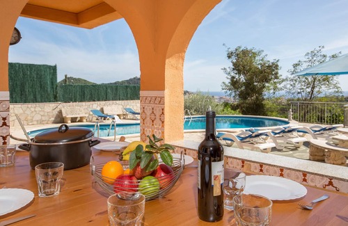 ¡Villa Carvajal is a charming 6 bedroom property located in a very quiet area in Blanes! where you can find restaurants, supermarkets, pharmacies and only 3km from the turquoise and crystalline beach of Blanes.If you are looking for a perfect place to spend your vacation with family, this property is the perfect fit for you!The wonderful external area includes a big swimming pool (12x6m) and amazing sea views. There is a barbecue and a large, covered terrace where you can have a poolside breakfast next to the pool.Living room with tv. Fully equipped kitchen including cutlery, cooking pans, fridge, toaster, microwave, oven, dish washer and washing machine. ¡Yes, we want you to enjoy meals as if you were at home! It has a living area of 230m2 (+ 750 m2 for plot) and sleeps 13 people.This house has 2 double rooms (135x190cm), 1 double rooms (150x190cm), 1 double room (150x190cm) + one sofa bed (150x190cm), 1 single room (105x190cm) and one room with 1 sofa bed for 2 people. There are one bathroom with bath and one bathroom with shower.- Sheets and towels are not included. Cost 8 euros/person/sheets and8 euros/person/towels.- Wifi not included. Cost 7 euros per day to pay on arrival - Cot and highchair: 5 euros/day/cot, 5 euros/day/highchairPets only on request with an extra cost.This property is only rented to families. Reservations of young people under 35 years of age are not allowed.