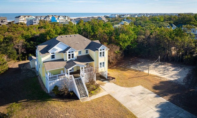 BookSmart Properties presents: Lola's Copacabana! This beach home caters to the whole family, offering a ground level with a rec room, 3 bedrooms, and a kitchenette. The mid-level features 3 bedrooms w/ a second living room, while the top level boasts a spacious great room, kitchen, dining area, and 2 additional bedrooms. Enjoy amenities like a private pool, hot tub, one-acre lot, volleyball court, game room and more. Beach access is only 155 yards away. Book your Corolla vacation now!