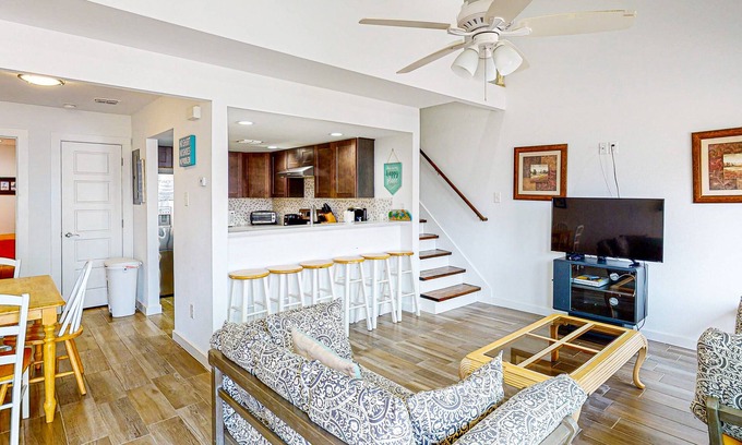 Enjoy the peacefulness of El Cortez on Mustang Island, just three miles south of Port Aransas. You will love the open floor plan and spacious living room and bedrooms with ocean life décor carried throughout this two-story home. Cable and Wi-Fi are available. Gather everyone in the living room to watch a movie on the TV while lounging on the couches that convert into 2 single beds. The kitchen is equipped with everything needed to prepare meals such as spacious countertops, stainless steel appliances, a regular drip coffee maker, dishes, basic pots, pans, and utensils. Enjoy meals at the dining table with seating for five and additional seating for six at the breakfast bar. Take your coffee out to the private patio to sip in the ocean breeze. The downstairs master bedroom (BR1) consists of a queen bed, nightstands, a chest and a closet. The ensuite bathroom holds a vanity and a tiled shower. Venture upstairs to the second bedroom (BR2) made up of a Queen bed, nightstand, a chest, and a TV. The ensuite bathroom contains a vanity and tiled tub/shower unit. This room also has a private balcony with views of the pond and resort. The loft area is made up of two Twin beds, a nightstand, TV, and movies for the kids. **No washer/dryer in the unit** Use the golf cart accessible boardwalk to spend a day at the beach. Cool off in the shared pool, a short walk from this unit, or sit under the covered area with shared charcoal grills for cooking up the day's catch. El Cortez is just five minutes from Port Aransas offering a variety of restaurants, shops, nightlife and fishing charters.