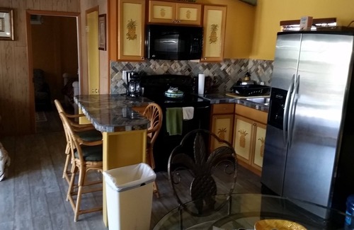 total sleeps 7 upstairs or 11 with 2 downstairs rooms which are $75 per night for each extra room. Also includes boat dockage for up to two boats. Upstairs bedroom has queen size pillowTop of line All New "PILLOW TOP MATRESS beds. QUEEN in the bedroom and a twin pillow top bed in living room house has wifi . The 2 guest bedrooms have 2 full size beds each bedroom has its own attached full bath. The 2 downstairs rooms each have 2 twin beds and own baths. A full kitchen with ice and water in the refrigerator, coffee maker kuerig and regular coffee maker bring your own coffee, toaster, stove and microwave. There is also a washer and dryer for you. Covered porch overlooking the dock with lots of seating and sun deck with lounge chairs. Fish cleaning station and a BARBACUE GAS GRILL.. Most of all we live near by if you should need anything. Check in 3:00 pm check out 10:00 am