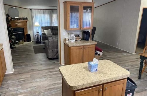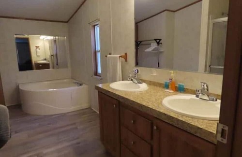 This house is on approximately 3 acres and includes a boat house. There is a tree swing in the front yard. The front porch has a few stairs and a wheelchair ramp. The house is about 1500 square feet and includes a master bedroom with one king bed and one bathroom with shower and garden tub. It includes a 32" TV with an antennae. Second bedroom includes queen bed and twin bunk beds. Third bedroom also includes queen bed and twin bunk beds. There is a shared bathroom with a tub and shower. The living room has a 58" Roku TV and DVD Player. The internet service is StarLink. Dining room has a sliding patio door that opens to the back yard.