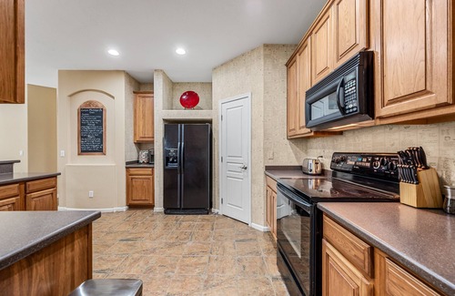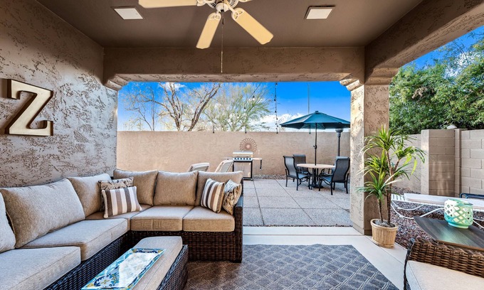 This private, one-story, 3 bed, 2 bath home is centrally located near stadiums, Spring Training, P83 and more. The peaceful outdoor oasis offers a private pool, lounge chairs, propane heater, outdoor dining table/chairs, and covered patio with comfy seating. Family-friendly w/ board games and comfy living room to curl up and watch movies. 2 pull out couches for additional beds. Office space w/ printer to WFH. Equipped w/ new beds, furniture, and quality bedding/linens. Garage for parking.