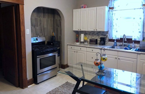 Freshly updated with modern convniences and nostalgic touches. Enter the enclosed porch with convenient washer/dryer access. The farm style eat in kitchen features high ceilings and farm style table, gas stove and normal kitchen amenities. Hardwood floors and no carpeting takes you back to a simpler time. The spacious dining room is open to the front living room and wraps around to the primary main floor bedroom with quick access to the bathroom. Bathroom features a corner shower (may not fit very large people). Two nice size bedrooms (one with a queen bed and one with two twin beds) and a landing with a large desk area are on the 2nd floor.