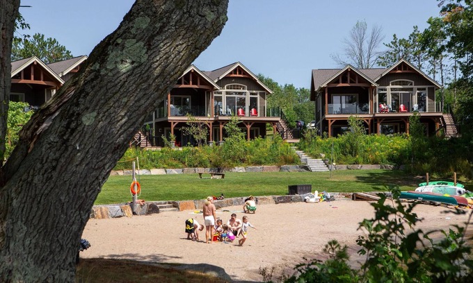 Villa 7B Large shared waterfront resort with a large dock, water bouncer. Each unit has it's own outdoor seating area to enjoy a sunset or some quiet activities on the deck or patio. Landscaped lawn with three shared fire pits to relax and enjoy the views of Lake Muskoka. Equipped with a pickleball /basketball court, horseshoes and many other family activities. There is also a clubhouse with games for everyone to enjoy.