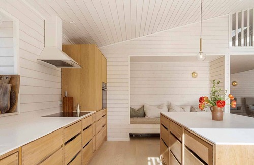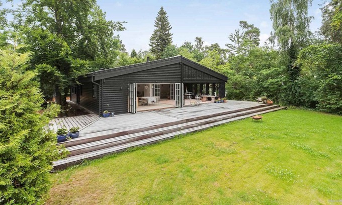 Enjoy a holiday in Hornbæk's most unique architect-designed holiday home. Indoor and outdoor life flow together via the striking folding doors that open the whole house up to an orangery, which is the heart of the house. Bathrooms are inspired by the sea and the forest, with tiles from floor to ceiling and a sunken tub. The second you enter this lovely home, you are greeted by the most wonderful holiday home atmosphere.