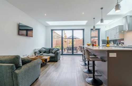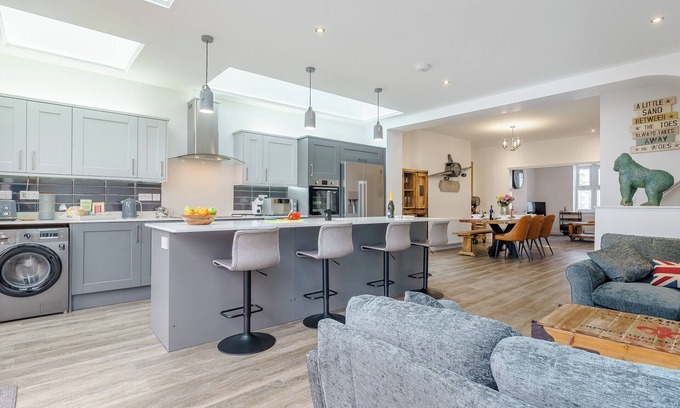 Light and spacious, the lounge with relaxing corner sofa and Smart TV, leads into the stylish kitchen/dining area where the design is contemporary, with spacious grey Shaker-style kitchen with granite worktops, large central island with bar stools and all the necessary appliances for modern day living. The space is light and airy and inviting, with large bi-fold doors bringing the outside in. A large table accommodates the group comfortably, and a wall mounted TV provides your entertainment.