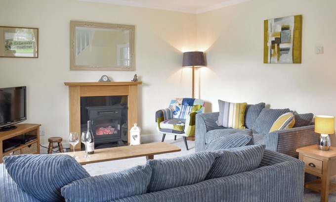Living room: With electric wood burner, 32" FreeSat TV, DVD player with a selection of DVDs and Bluetooth speaker.