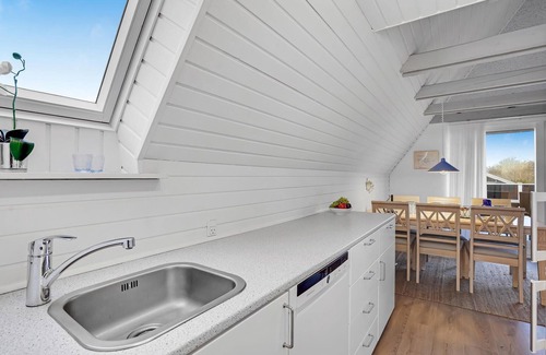 In an attractive cottage area on Røsnæs you will find this tastefully furnished vacation home. It is located on a hill and has a view of the sea. The cottage is charmingly furnished with an open kitchen to the living room, a nice bathroom and a bedroom with a single bed on the first floor. A staircase with handrail leads to the bedroom on the second floor with a double bed (not for people with walking disabilities). From the living room you can access a secluded terrace where you can enjoy the sun, relax with a book and dream. In the annex there are 2 more sleeping places, perfect for a couple or teenagers. There are also toys here for the youngest members of the family.