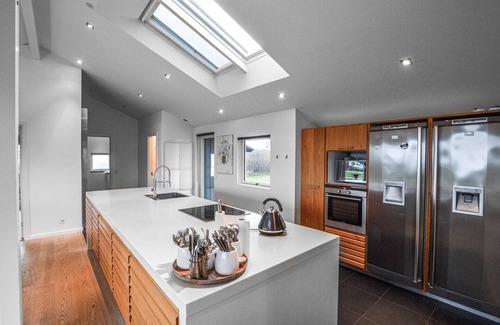 This interesting architect designed vacation home has a wonderful view of the Great Belt. In front of the large living room with the modern open kitchen is the spacious terrace with a barbecue. Here you can enjoy the sun in nice weather and and in the evening in the glow of the sunset end your vacation day.