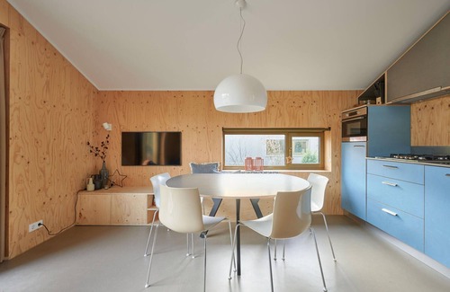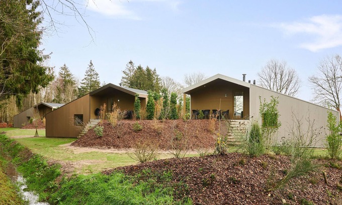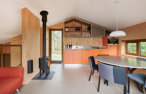 Welcome to this inviting and modern house on three floors. The architecturally playful design offers a unique spatial experience and has been carefully decorated in a modern and minimalist style. Here you can escape the hustle and bustle of everyday life and completely relax in beautiful natural surroundings. The colourful, fully equipped kitchen invites you to prepare delicious meals. Get together at the special dining table, relax on the sofa with a good film or enjoy the warmth of the wood-burning stove in the evening. From the living room you have a beautiful view of the forest and the Terhorsterzand nature reserve with its heaths, forests and moors.