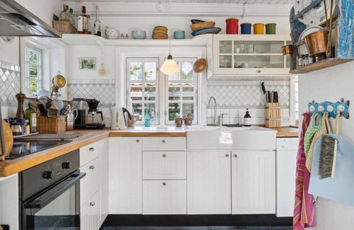 Enjoy a relaxing vacation in this family-friendly and cozy vacation home near the beach. Settle into the rooms and enjoy the cozy living room, with mullioned windows or the dining kitchen, which is the center of the house, bringing the whole family together to cook, eat and linger by the fireplace. Step outside from here onto the inviting wooden deck and enjoy a cool drink and the sun. The garden offers plenty of space to play together on the lawn or lie on the sun loungers and listen to your favorite podcast.