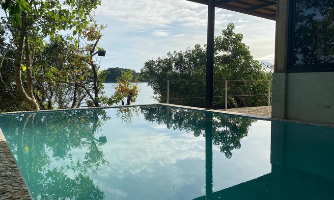 Brand new 3 bedroom house with private beach and pool. View out to reefs, islands, and sunsets. We offer island-hopping, scuba diving, kayaks, and snorkeling gear. Fast Starlink satellite wifi, Netflix. Meals available or cook your own. All solar powered. Can sleep up to 18 guests in 3 bedrooms and a large common room that has two sofa beds, TV, kitchen, and two dining tables. Upper bedrooms have two queen beds each and are accessed via outside stairs.