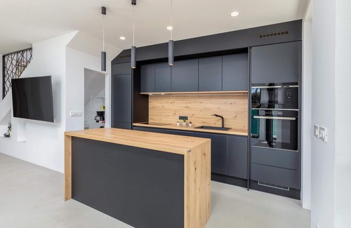 This holiday home is perfect for a holiday with friends or family and impresses with its modern design and carefully selected details, which you will find in every corner. You will be particularly impressed by the outdoor area. On the first floor you will find a large sun deck. Here you can spend many hours on one of the sun loungers. The terrace has a relaxation area and a dining area. Here you can enjoy breakfast together or round off the day with a glass of wine. There is also a barbecue for cosy barbecue evenings. The pool has an electrolysis system and also offers you a pleasant massage as it has built-in jets. You will spend many pleasant hours in and around your pool. Seek additional relaxation on the beautiful sun loungers by the pool as well as the large bed loungers. There is also a trampoline for the little ones.