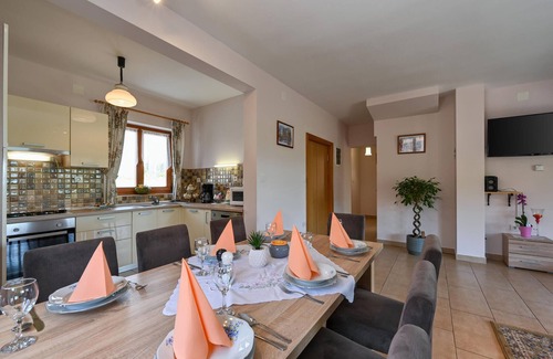 This beautiful wooden house welcomes its guests in the middle of a picturesque landscape near Tuhelje. Relax in the modern and attractively furnished rooms, where you will find everything you need for a carefree vacation. Enjoy meals together without the hustle and bustle and with a beautiful view of the countryside.