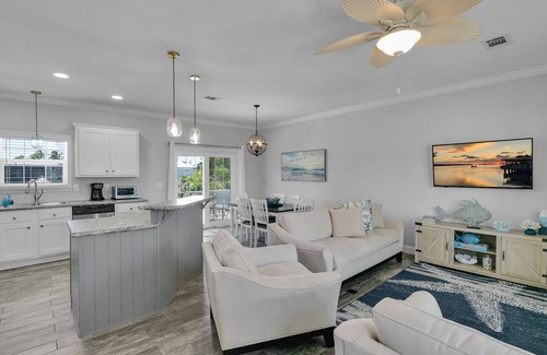 The space is a 3 bedroom, 2 bath waterfront property. The house is on a canal, very close to the bay. The full kitchen has a microwave, refrigerator and an oven. TV is provided as well as Wifi. Washer/Dryer also available. Two bedrooms each have a full over full bunk bed. The master has a queen bed. All rooms have a TV. Outside enjoy kayaks, dock, above-ground pool overlooking the canal. Fish off the dock. Access to a private beach is also available.