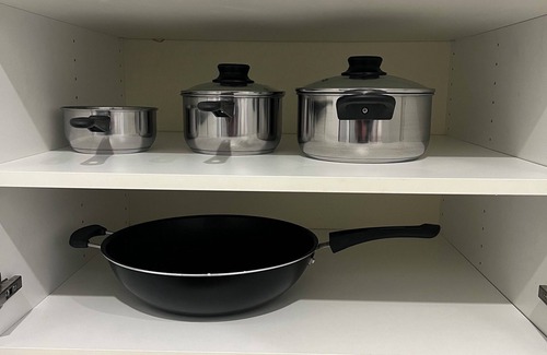 The kitchen is fully equipped with modern amenities, making it easy to prepare everything from a quick breakfast to a full dinner. With stylish glassware, plates, and utensils, you'll have everything you need to enjoy your meals.
