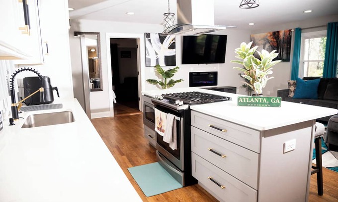 Welcome to Atlanta! This modern upscale property will have you feeling like you're in your own private getaway. This home has been furnished with modern furniture and accents. The Turquoise and Grey color tone gives it a vibrant and delightful sense. Free WIFI, Air Fryer and Laundry unit are included. Hartsfield-Jackson Atlanta International Airport is only 6 miles, Mercedes-Benz Stadium is also 6 miles. Say Hi to the fish, turn on that fireplace, kick back and relax in this calm stylish space.
