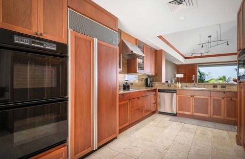 The gleaming gourmet kitchen is fully equipped with top tier appliances, smooth wood paneling, and a countertop bar with 3 barstools. The kitchen also includes a built-in desk as well as a lovely balcony with breakfast table overlooking the immaculate courtyard. Floor to ceiling sliding glass pocket doors open from the great room to a large covered lanai (porch) with a regal dining table set for 6. It also includes an outdoor barbecue grill, perfect for BBQing freshly caught Ahi or Mahi Mahi, and a large lounging sofa set, all facing west towards the garden and ocean.