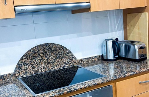 Kitchen equipped with toaster, kettle, oven, microwave, fridge, hand blender, freezer, ceramic hob, plates, pans, pot, etc. You only need to bring your own food.