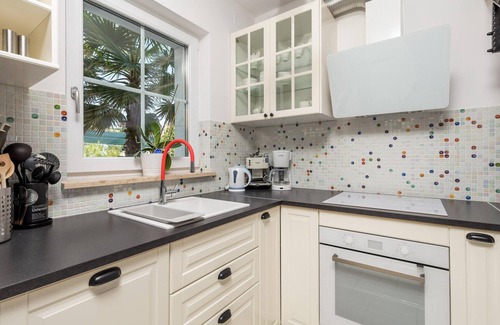 This wonderful holiday home with pool is located on the island of Krk in the small village of Korni. It is about a five-minute drive from the historic town of Krk and the town of Punat with its well-protected harbour. Due to its hilly location, the house offers a fantastic view of the sea and the olive groves for which the region is famous. The lovingly furnished house is built in typical island architecture and consists of a successful mix of modern and traditional elements. From the living room you have direct access to the terrace with barbecue, lounge and sunbathing area and heated pool. The master bedroom is on the ground floor and the other two are on the upper floor. The house is air-conditioned, has underfloor heating and there is also parking space on the large, fenced plot.