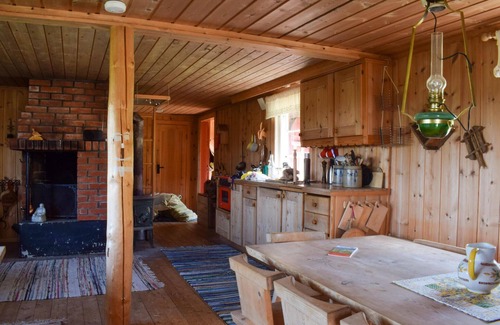 Enjoy a relaxing stay in this rustic hut with space for a large family. Numerous outdoor activities await you right on the doorstep. The surrounding area is ideal for fishing, cycling and long hikes. Make yourself comfortable in the cosy living area. The rustic charm with lots of wood and lovely details creates a warm atmosphere. Relax on the large sofa and enjoy your meals together at the neighbouring dining table. On cooler evenings, warm yourself by the fireplace or wood-burning stove.