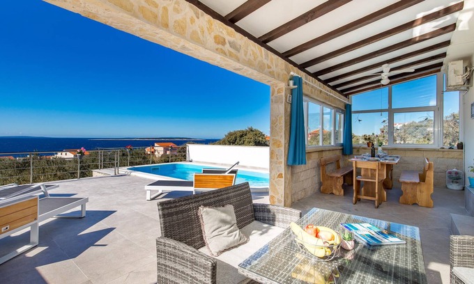Enjoy the panoramic sea view you have from the terrace of this vacation home. It is furnished with many beautiful details. Experience social hours on the enclosed terrace or relax on the terrace with barbecue and garden furniture, while your children play carefree in the garden area with swing and seesaw. On hot summer days you will find refreshment in the pool. Visit the beautiful beaches in Mandre as well as in the many other places on the island.