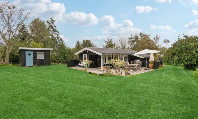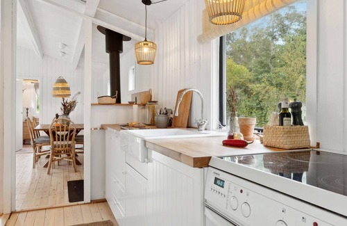 Welcome to this cozy vacation home, which awaits you in an idyllic location just a few steps from the fjord. Relax with your loved ones in an appealing ambience, the bright rooms get their charm from the beautiful daylight coming in through numerous windows, in the living area you will feel close to nature during your activities. Organize cozy game evenings at the large dining table and create a particularly cozy atmosphere with a fire in the fireplace.