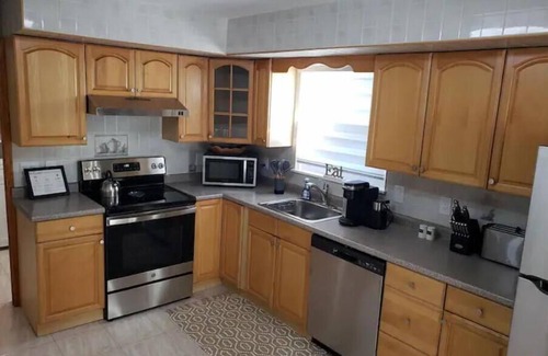 -Full Kitchen: contains key appliances like a fridge, stove, air-fryer, microwave, toaster, Keurig and tea kettle. Available for use are pots, pans, silverware, cups and plates