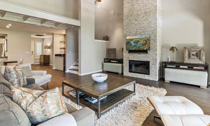 In Ponte Vedra Beach, enjoy this lovely three-bedroom getaway that's within walking distance - about fifteen minutes away - from famous TPC Sawgrass. Relax in the private pool, or venture out to explore nearby attractions like the St. Johns Town Center, a 19-minute drive away, and the University of North Florida, just 17 minutes from your door.
