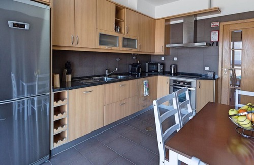Fully equipped kitchen with breakfast table. Induction 4-ring electric cooker, built-in electric oven, microwave, fridge/freezer, dishwasher, Delta capsule coffee machine, kettle, toaster, toasted sandwich maker, hand held liquidizer, liquidizer. Opens to the swimming pool solarium.