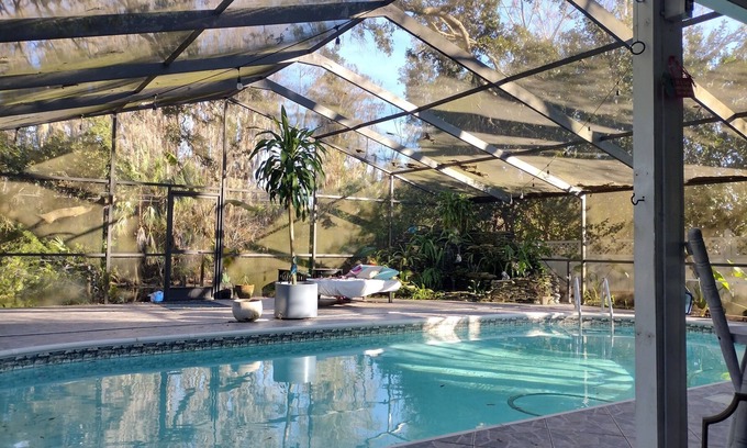 Come enjoy the real Florida! Located on the Florida birding trail only 10 minutes from the Gulf enjoy nature relaxing by the pond or pool under 200-year-old oak trees! Take some time to explore the arts, read a book or enjoy the small town feel of downtown New Port Richey! We live in the connected Mother in law suite on the end of the residence with our two pups so the back yard is shared. Your space is completely private.