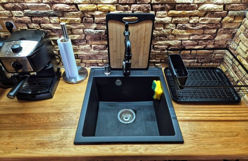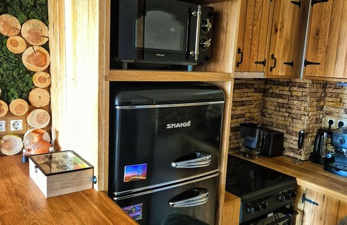 Prepare your favorite meals in a fully hand-made wooden kitchen, equipped with everything you need—from free coffee and tea to a water filter for a healthy vacation. Enjoy your meals at the kitchen bar with high chairs, the dedicated dining area, or the charmingly lit balcony.