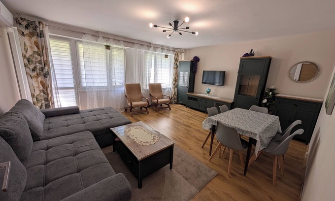 Nestled in city center Żywiec, this apartment offers a large living space for guests. With 3 rooms with room for 6 adults plus 2 kids and an infant, there's plenty of room for everyone. The bathroom features a shower and washer for your convenience. Plus, there's an additional living room with a a very large sofa bed for extra relaxation. The apartment is located off the main road, in a quiet area with free parking. Air Conditioning, wifi, and steps from restaurants, grocery store, and playground make the apartment perfect for everyone.
