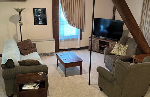 Don't let the rustic entrance fool you, comfort awaits at the top of the stairs in the spacious loft.(This is an old carriage house, with the original stairs. Eight steps to a landing and eight more steps to the door.)