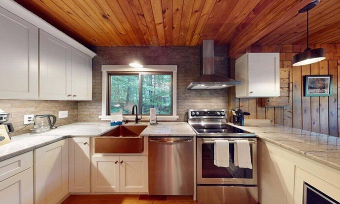 The Treehouse is a 6-bedroom, 3-bath vacation home on Okemo Mountain, just a two-minute drive or 10-minute walk to the Clock Tower Lodge. Ideal for large groups or families, it features two living areas, a game room, and a private half-acre wooded lot. Step outside to a spacious deck with an outdoor dining area and a fire pit by a charming stream, all surrounded by a beautiful stone wall. This secluded setting offers peace and privacy while keeping you close to all that Okemo has to offer. Inside, the newly renovated gourmet kitchen includes stainless steel appliances and a large island, perfect for preparing everything from quick breakfasts to gourmet meals. High-speed internet makes remote work easy, and the wood-burning fireplace adds a cozy touch. Enjoy year-round activities like skiing, hiking, and nearby golf. Note: Bunk beds have weight limits, and the property does not have air conditioning.