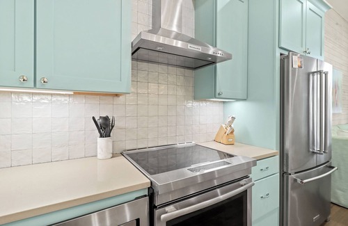 The primary living space is an open-concept main living area on the first floor. It combines a comfortable living room, a dining area at an oversize island, and a fantastic kitchen, all surrounded by whitewashed shiplap walls. Relax on the seafoam green, sectional sofa for TV time or hang out on bar stool seating at the island for a snack or meal. The induction cooktop pleases the chef in the group, along with stainless appliances and plenty of prep space.