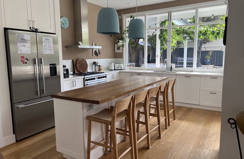 Our home is located just 290m from the beautiful Freshwater Beach, a favourite surfing spot! Newly renovated with no expense spared. There are 4 bedrooms + guest room. 3 full bathrooms and an outdoor powder room. Fully equipped kitchen, butler's pantry and separate laundry. Gorgeous lounge room with gas fireplace. Covered outdoor living and dining areas, gas BBQ, wood burning fire and in-ground heated pool. A huge spring free trampoline and basketball hoop. We can't wait to host you!