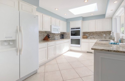 Heading back inside, we find a wonderfully open kitchen at one corner of the great room, boasting wraparound counters with bar seating, as well as dual ovens and nearby powder room to make entertaining a breeze. Speaking of which, the whole group will want to gather around the private wet bar to the other side of the great room adjacent to another private outdoor space.