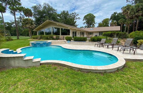 Boasting 270-degree golf views amidst blissful privacy, this stunningly tranquil and exquisitely updated vacation home is ideal for those seeking a true island getaway.