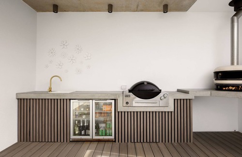 With four generous bedrooms and three modern bathrooms, the home comfortably accommodates families or groups. The sun-drenched open-plan living areas connect effortlessly to outdoor entertaining zones, which include a fully equipped outdoor kitchen with a BBQ, pizza oven, sink, and fridges—ideal for lazy summer afternoons with friends and family.