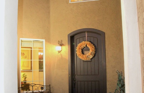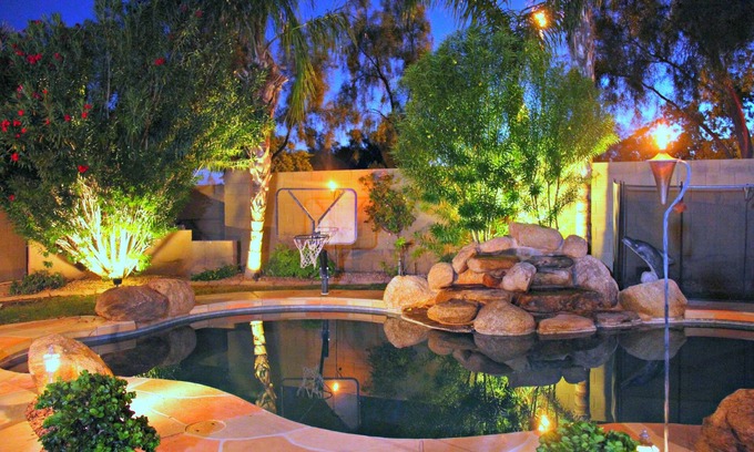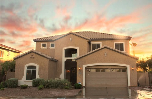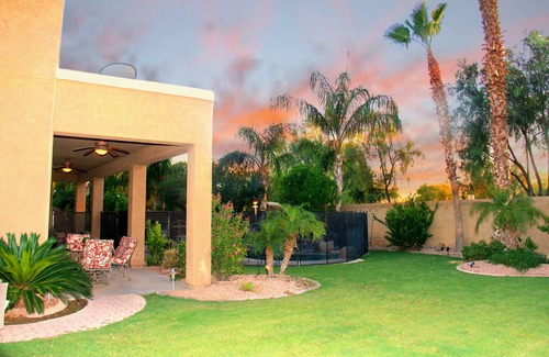 The backyard features a private fenced in pool (Heating the pool is an extra charge ) with a rock waterfall. The kids will love to run on the large grassy area and play in the play house. Enjoy the outdoor grill and grand patio for your BBQ's and soaking in some beautiful Arizona weather!