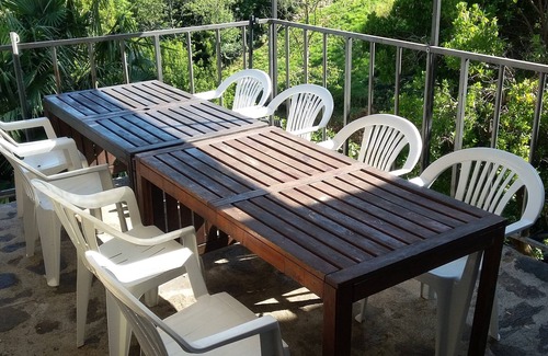 Absolute quiet position: Our large natural stone house (220 m²) with antique details (old stone floors, old beams, lovingly restored) and a lot of atmosphere is situated in a fantastic panoramic position on a slope. The landscape is unspoilt, there are many old chestnut and cherry trees. Relax on the balcony or on one of the terraces in the garden - with sun and shade spots. Bathing places (rivers and lakes) are within easy reach, it is a good hour's drive to the sea. The large house, 2 floors, balcony terrace and 2 garden terraces, is ideal for the vacation of several families or a larger group. The upper living room can also be used as seminar/group room!